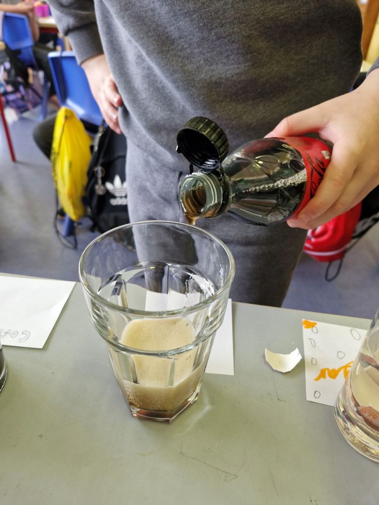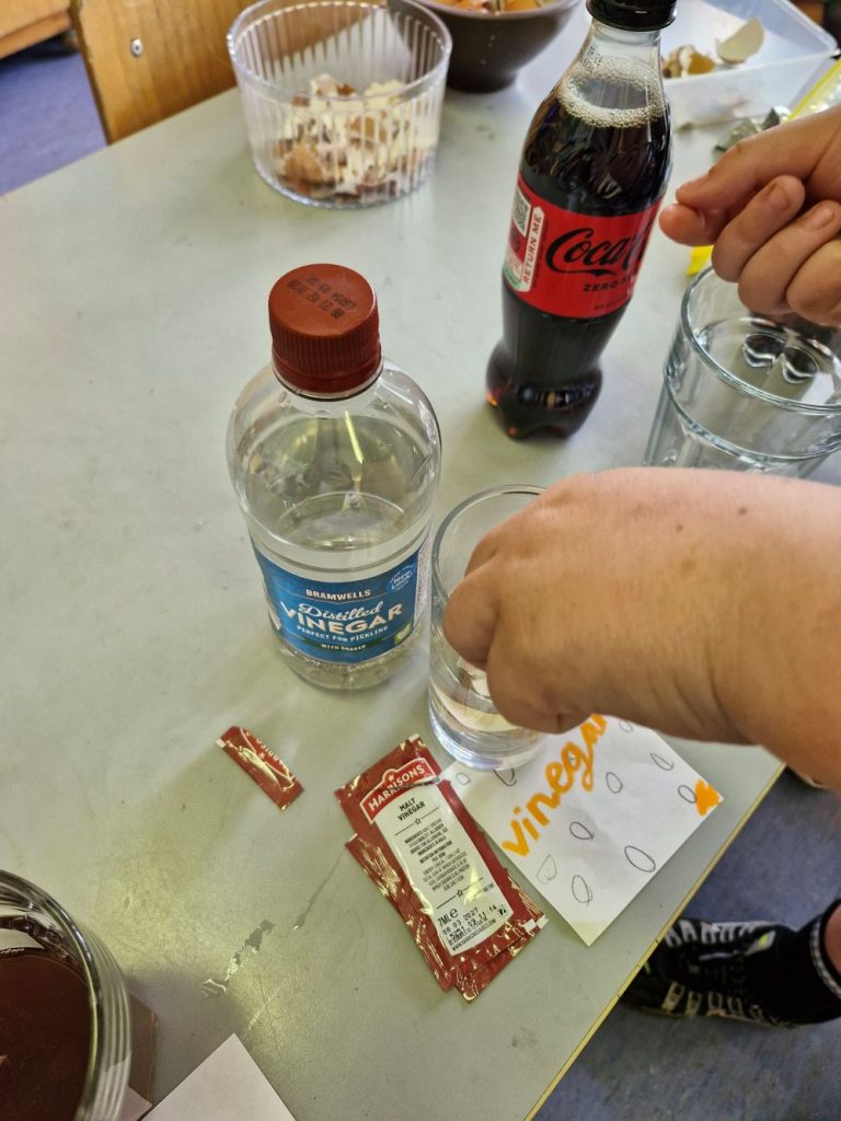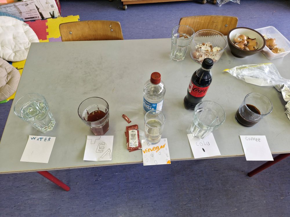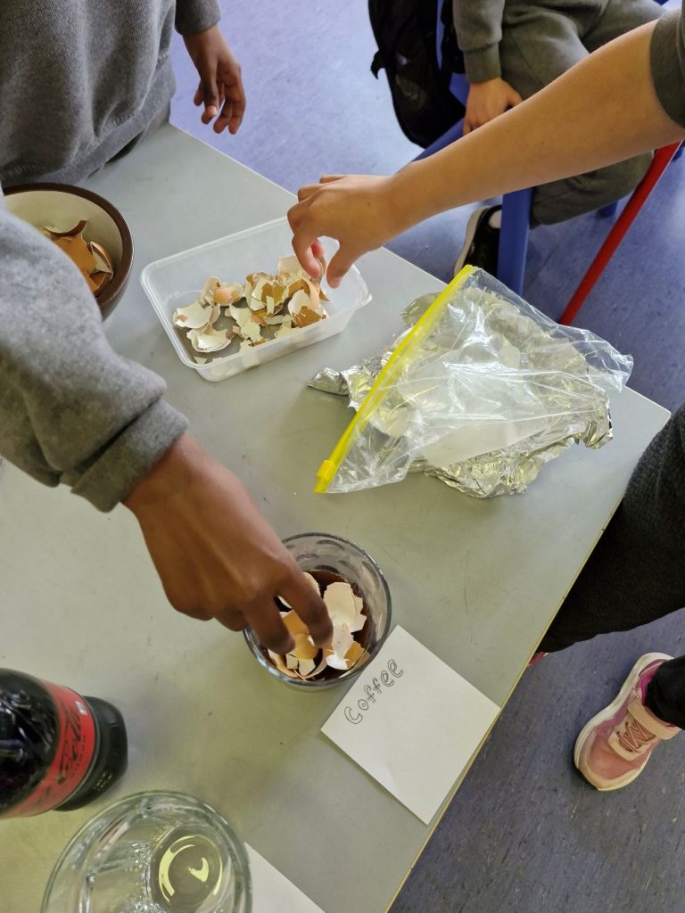 We completed an experiment using eggshells, tea, coffee, water, vinegar and cola.