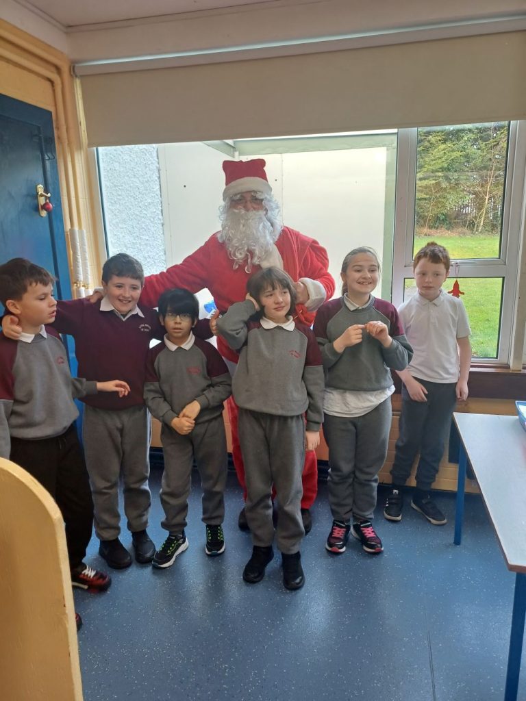 Santa took time out of his busy schedule to visit all the children in Scoil Mhuire and he gave them all a box of sweets to share with their classmates. Each class sang Santa some lovely Christmas Songs.